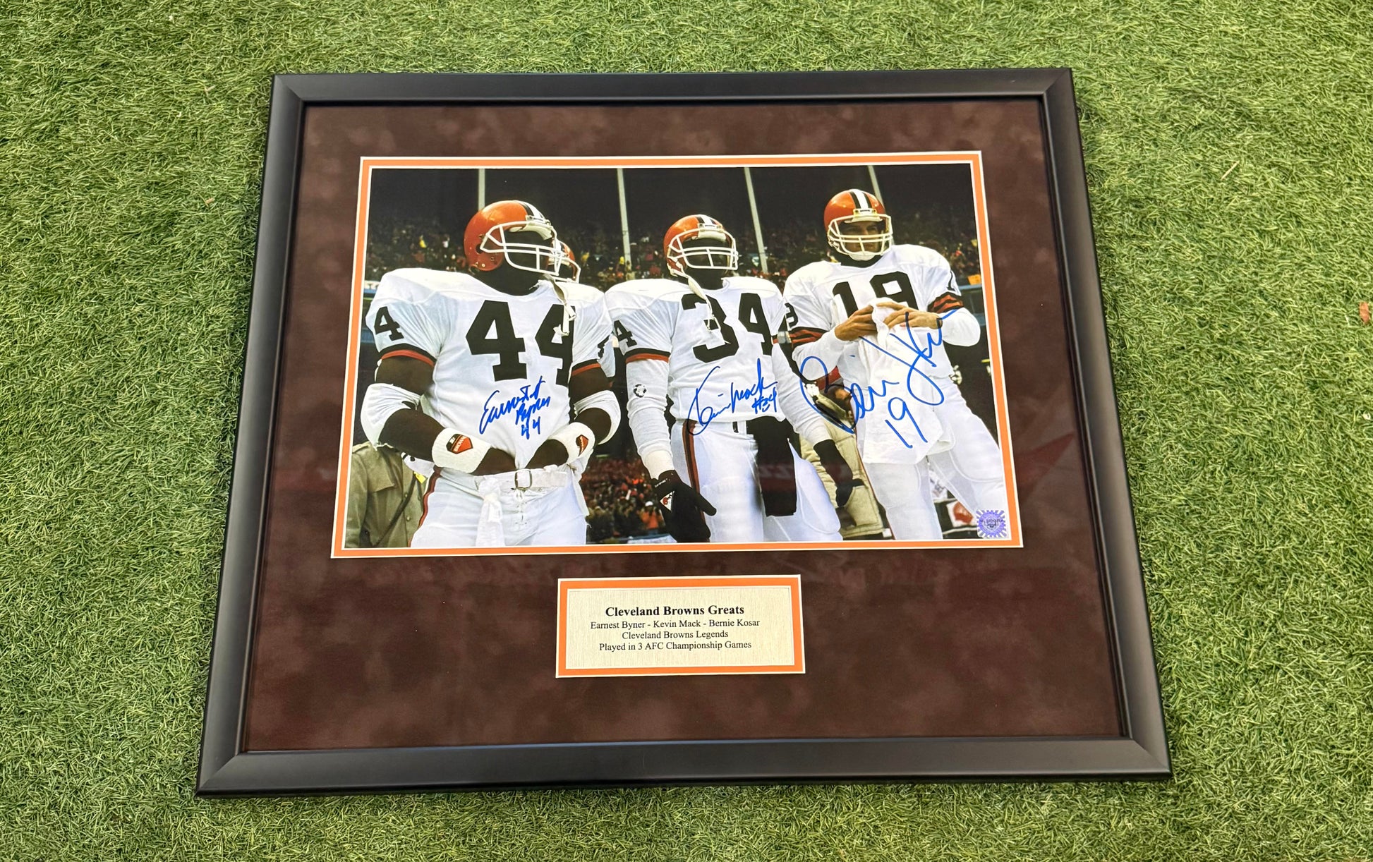Earnest Byner, Kevin Mack, and Bernie Kosar Autographed picture at municipal stadium. These Cleveland Browns champions played in 3 AFC games. These were signed at our store in person and certified by Hall of Framers.