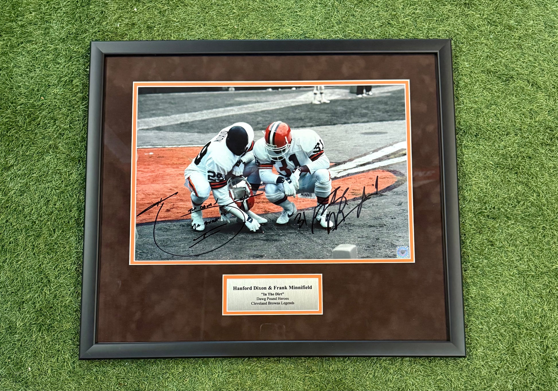 Hanford Dixon and Frank Minnifield drawing up the iconic play in the dirt pregame ritual. Enjoy this hand signed piece certified by Hall of Framers.